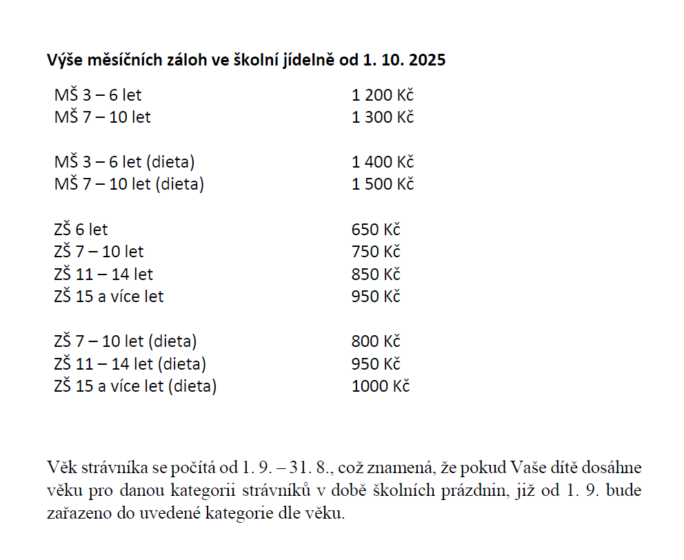 Nová paní vedoucí, Monika Adamcová, přepočítala výši záloh tak, aby se neopakovala situace ze září, kdy bylo 22 pracovních dní, které ovšem výše zálohy nepokryla, a proto nešlo přihlásit obědy. Nová výše záloh je uvedena v tabulce – dítě se zařazuje do věkové kategorie podle věku, kterého dosáhne k 31. 8. daného školního roku. Změněny jsou jenom zálohy, cena oběda se nemění. Prosím přenastavte si trvalý příkaz odesílání záloh na obědy co nejdříve, ideálně již k 25. 9.
